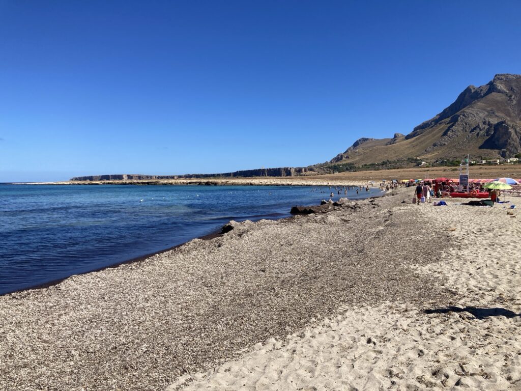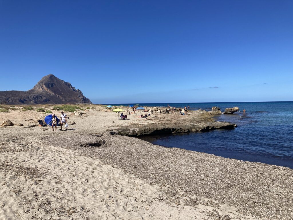 Die Baia Santa Margherita liegt eingebettet zwischen markanten Felsen und dem tiefblauen, glasklaren Wasser des Mittelmeers. Der imposante Monte Cofano wacht über die Bucht und verleiht dem Ort eine fast mystische Kulisse. Die Natur hier ist rau und gleichzeitig wunderschön: trockene, sonnenverbrannte Hügel, salzige Meeresluft und der ununterbrochene Rhythmus der Wellen.