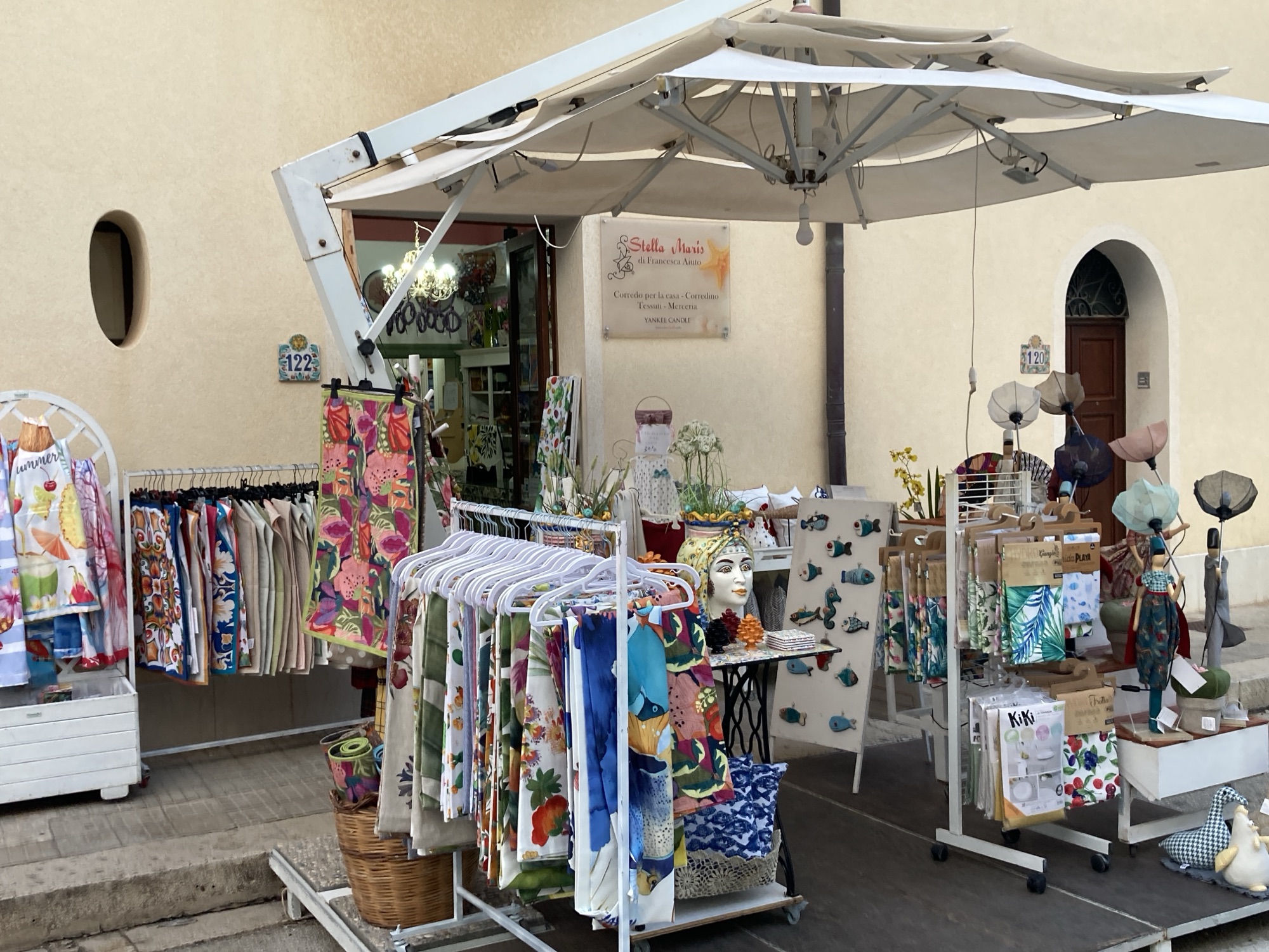 Das Geschäft Stella Maris im Herzen von San Vito Lo Capo ist eine kleine Oase für alle, die das Besondere lieben. Hier findest du elegante Wohnaccessoires, handgefertigte Heimtextilien und ausgesuchte Dekoartikel, die deinem Zuhause eine mediterrane Note verleihen. Neben stilvollen Tischdecken, Servietten und bestickten Stoffen gibt es auch eine feine Auswahl an Yankee Candles und weiteren Duftaccessoires, die für gemütliche Atmosphäre sorgen.